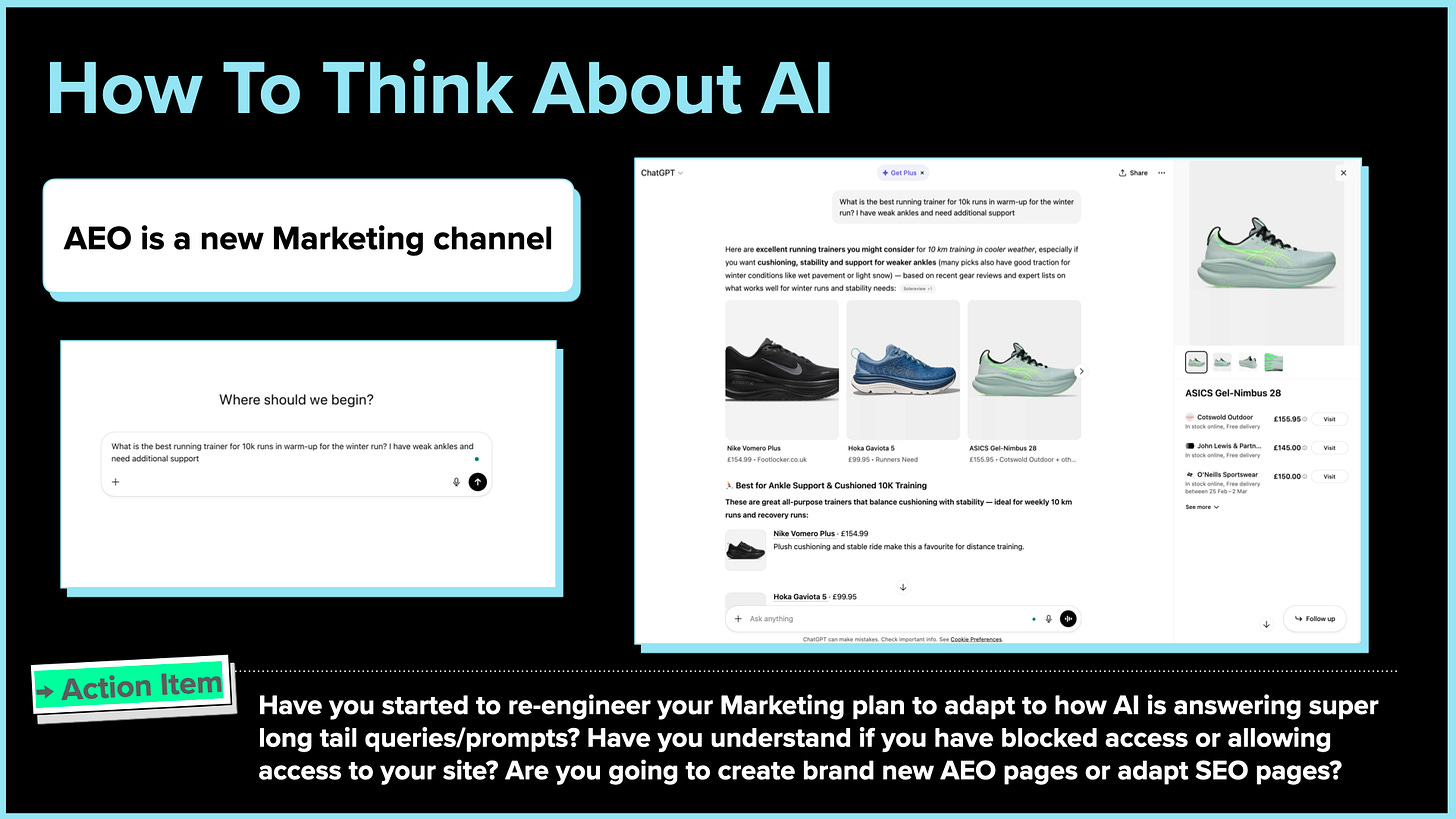 AEO is a New Marketing Channel: Answer Engine Optimisation (AEO) is critical, as businesses must adapt their marketing to how LLMs answer long-tail queries and recommend specific products with purchase links, like the example shown in ChatGPT.