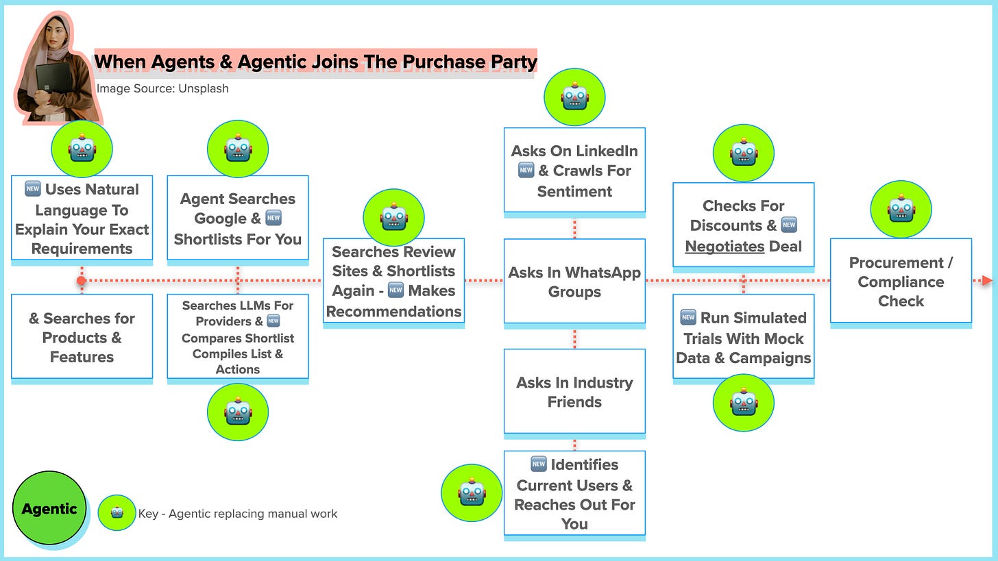 Shifting User Journeys: The customer journey is evolving from the traditional path to Assistant-Mediated (AI-recommended purchase) and finally Fully Agentic (AI researches, negotiates, and completes the checkout).