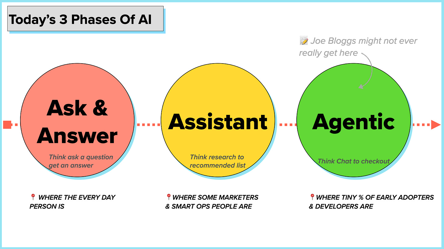 The progression is Ask & Answer → Assistant → Agentic and many are stuck in the old way of thinking, which is Phase 2 - Assistant