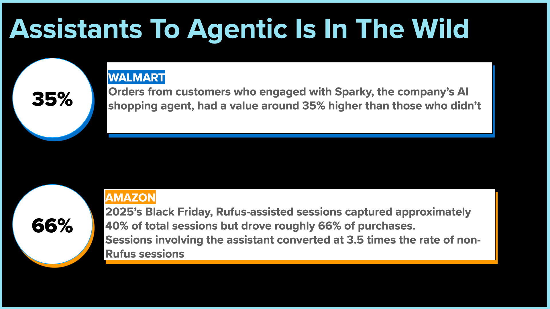 Agentic Commerce ROI: Examples from Walmart and Amazon show that AI-assisted shopping sessions are driving significantly higher purchase values and conversion rates (e.g., Amazon’s Rufus assistant sessions converted at 3.5x the non-Rufus rate).